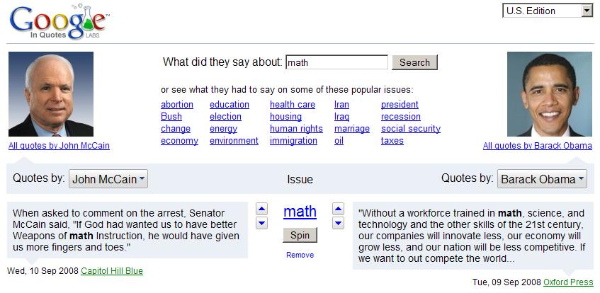 The “In Quotes” feature allows you to find quotes from stories linked to from Google News. These quotations are a valuable resource for understanding where people in the news stand on various issues. Much of the published reporting about people is based on the interpretation of a journalist. Direct quotes, on the other hand, are concrete units of information that describe how newsmakers represent themselves. Google News compiles these quotations from online news stories and sorts them into browsable groups based on who is being quoted.