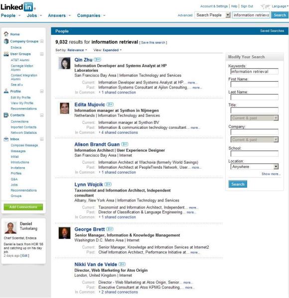 Today LinkedIn officially anounced the launch of its new search platform. It’s slick, and it’s certainly an incremental improvement on their previous search functionality. But I still think they would benefit tremendously from faceted search, or from any approaches that enable exploration of large result sets, such as this one: