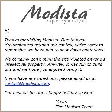Long-time readers may recall my post about visual search startup Modista last November, or this guest post by one of its principals. Unfortunately, the story has a sad ending. I hope that both this technology and its developers find a good home.