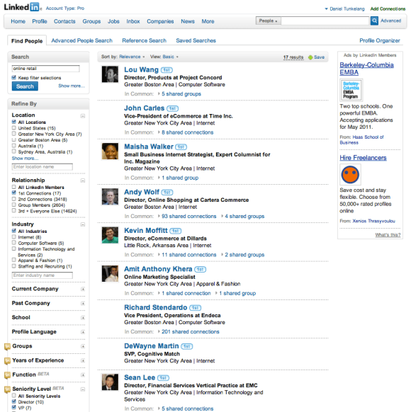 We then browsed through the list of top online retailers, identifying plausible companies for them to target and then looking for my first-degree and second-degree connections not only at those companies but also at other companies in the same space. We spent over an hour fluidly going back and forth between talking and exploring on LinkedIn. In the course of this exploration, we not only produced a list of people to contact, but also arrived at a better understanding of the business strategy.